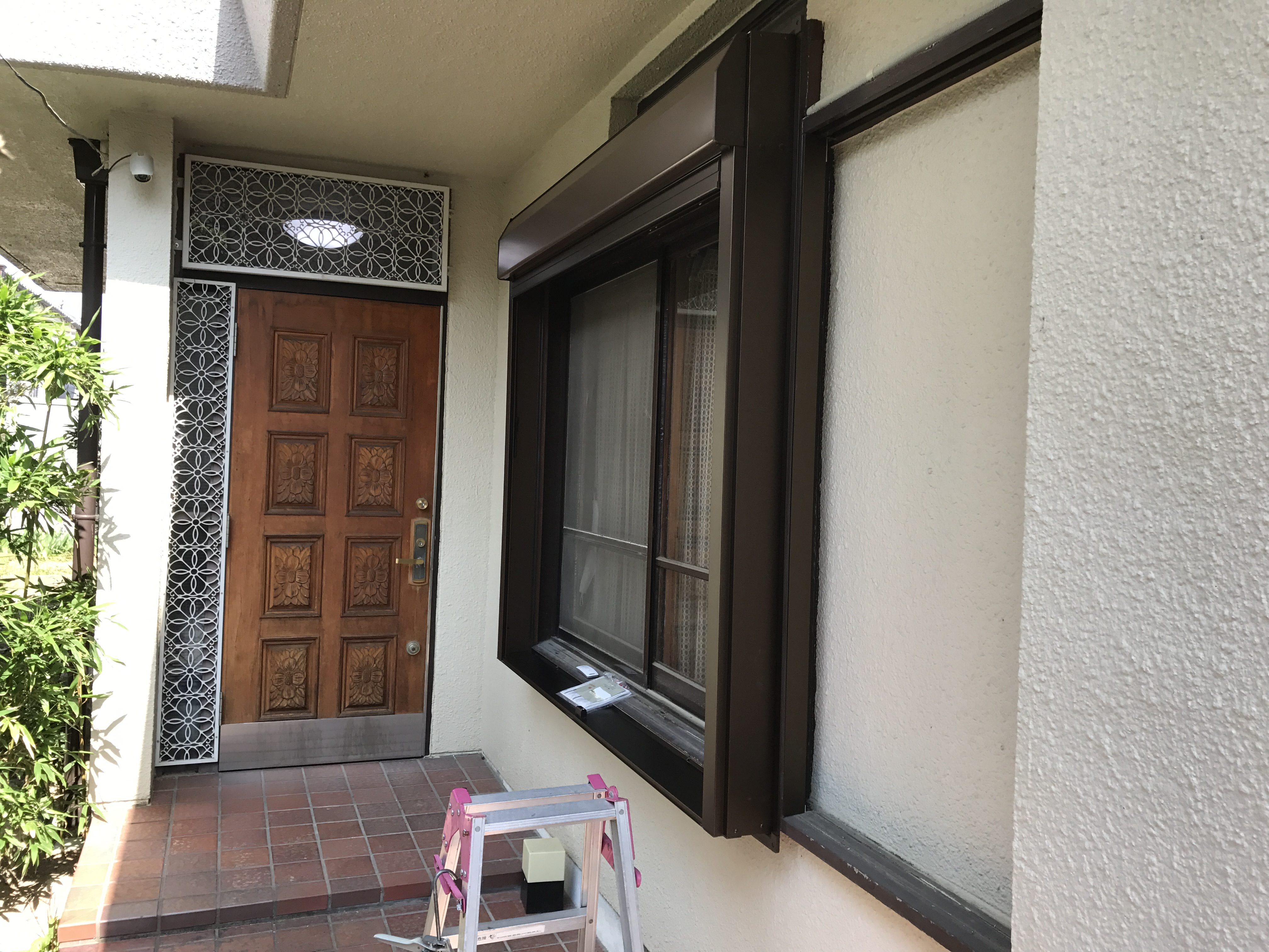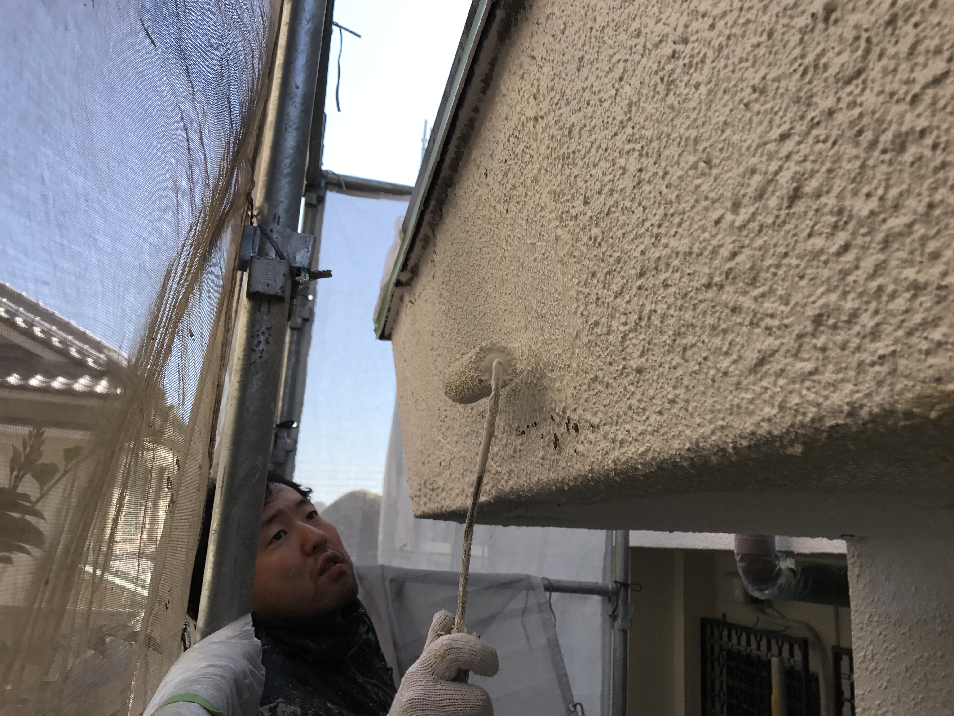 - 足場仮設、外壁塗装、網戸新調、電動シャッター取付工事 電動シャッターを取り付けたあとに足場を組み立ててから、 外壁塗装工事に入りました。