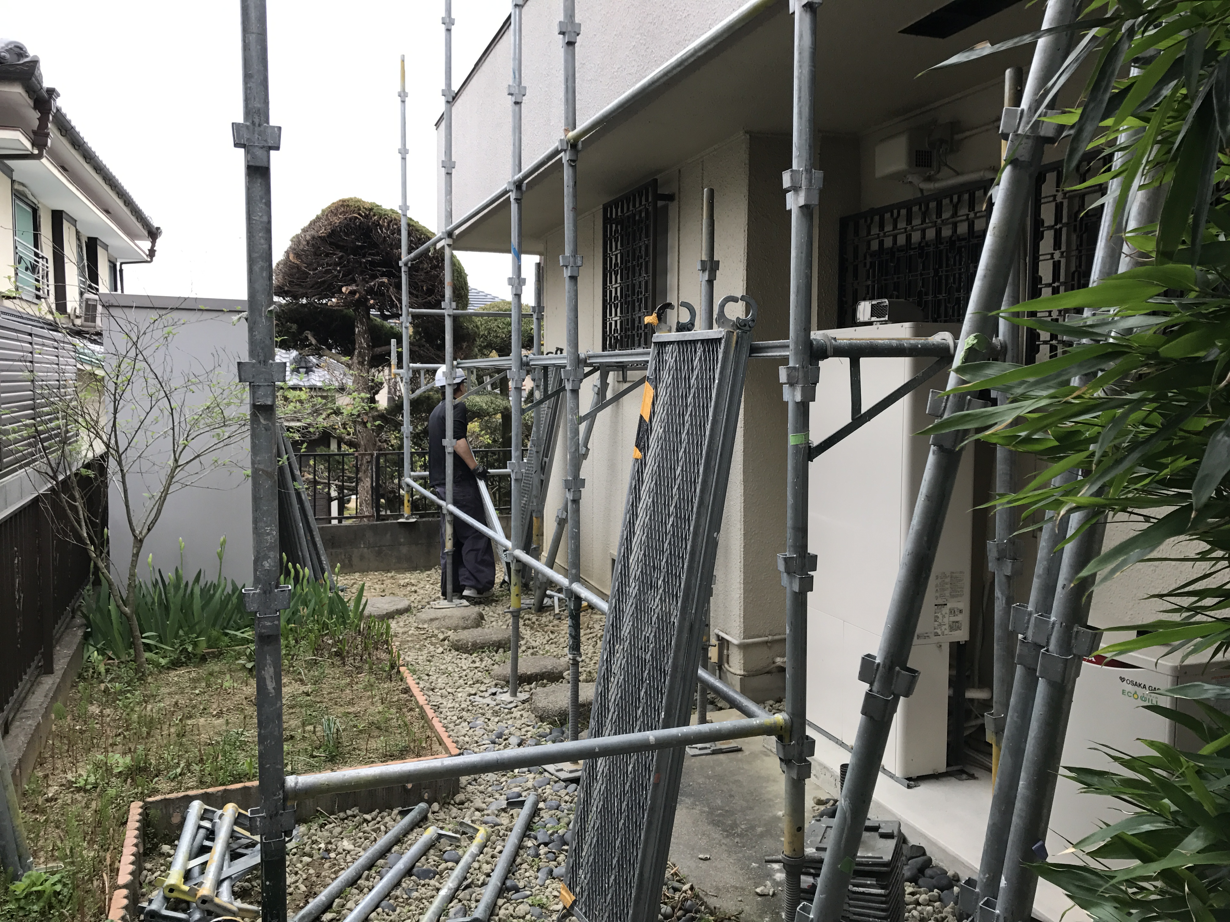 足場を組み立てています。平米が大きい家ですが、一日で組立終わりました。