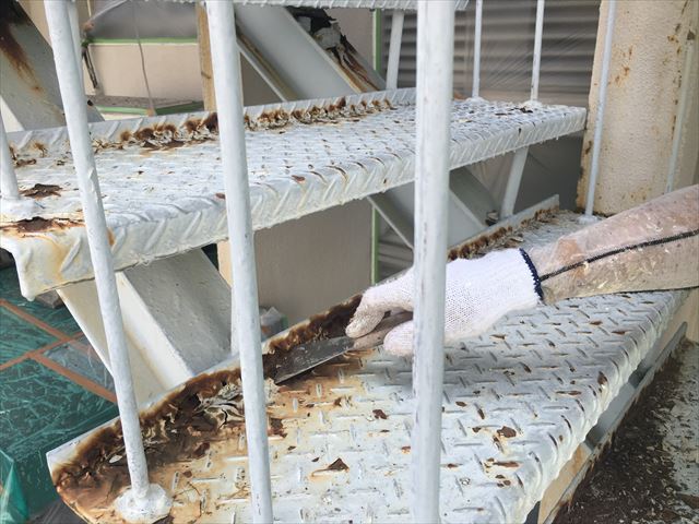 錆びている部分をカワスキやペーパーなどで削って錆を除去していきます。