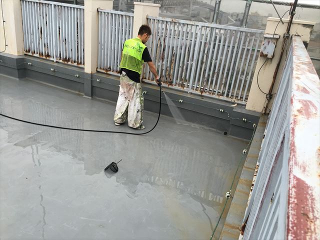 下地の補修が完了したので、高圧洗浄に入っていきます。