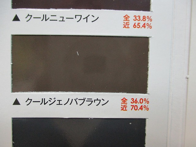 今回使用したのは「クールジェノバブラウン」というカラーです。サーモアイシリーズの色の中では中間色の分類に入ります。遮熱塗料はトーンが明るい色(白など)の方が、日射反射率も高くなります。