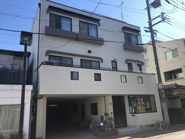 城東区にある築40年程度と思われる3階建て住宅の外壁塗装工事を行いました。建物裏面には足場がかけられないので3面足場で塗装も3面のみおこないます。1階部分でそろばんとピアノ教室をされているため一日中人の出入りがあるので注意が必要です。