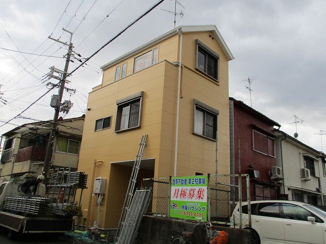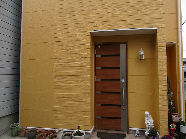 壁は黄色で樋や水切りなどの鉄部付帯部は白で仕上げています。パッと周辺が明るい印象になりました。