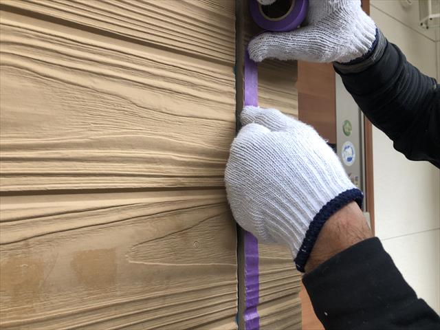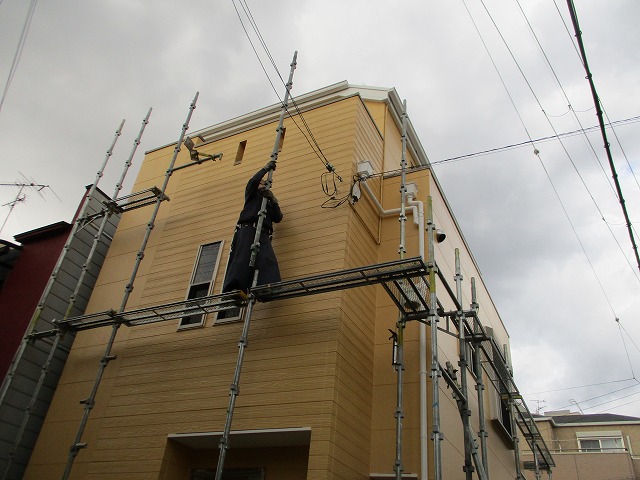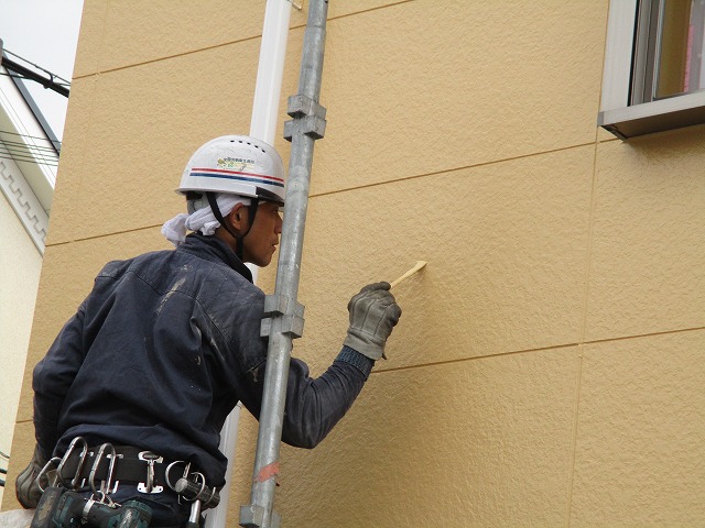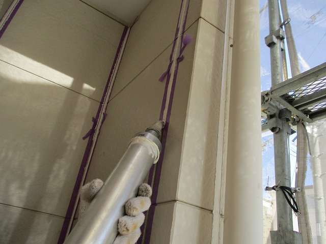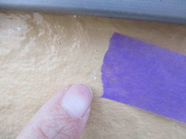 コーキングを充填させた後は足場屋さんに壁用の塗料を渡してあるのでそれをつかってチョンチョンと補修跡を隠してくれます
