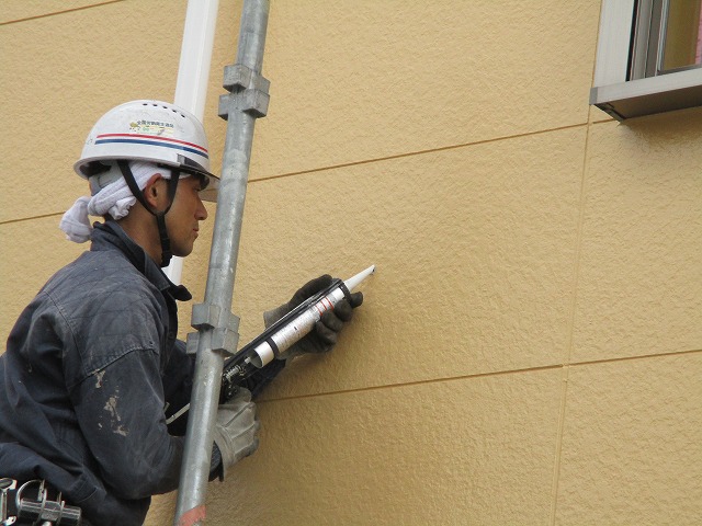 今回は3面のみの塗装だったため足場の倒壊を防ぐため壁に穴を開けてそこの器具を差し込み足場を固定していましたのでその穴を解体と同時にコーキングで塞ぐ必要があります。