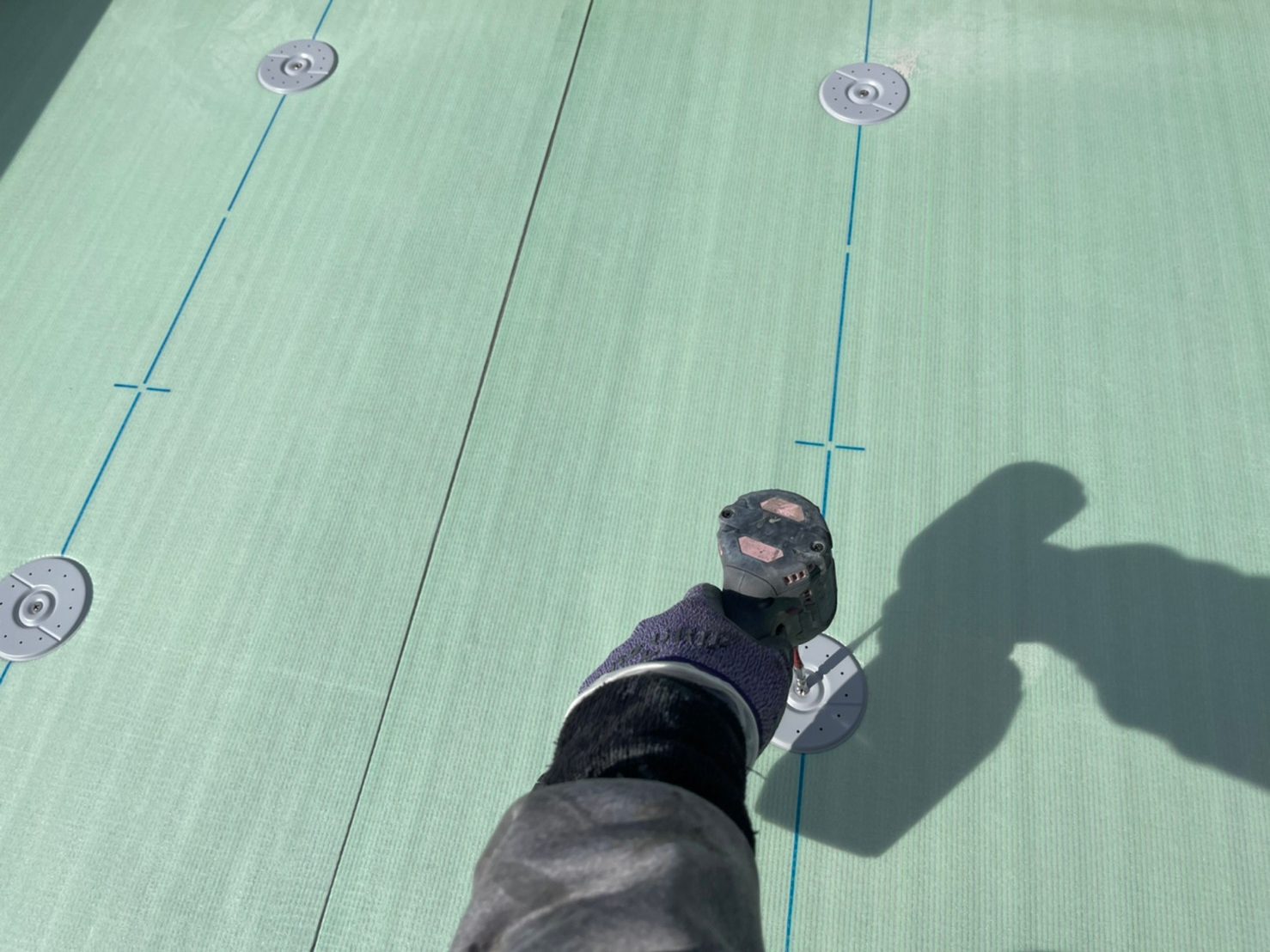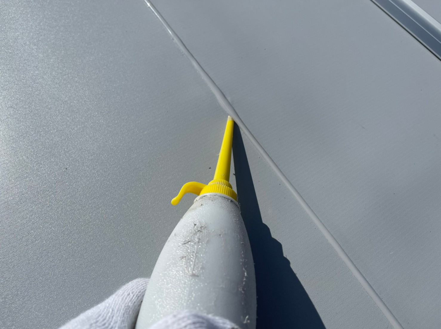 シートとシートの接合部分に問題がないか確認してから、ジョイントシーリング材を接合部分に塗っていきます。