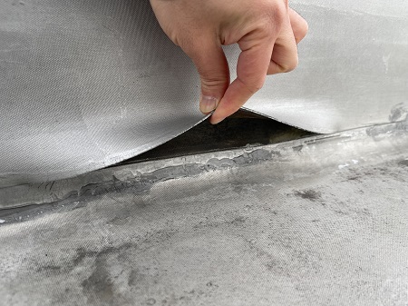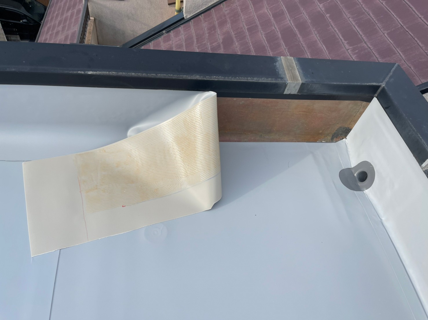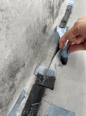 現場を拝見させていただいたところ、既存のシート防水が捲れており、お客様ご自身でテープを貼って応急処置をされていたとの事でしたが、これでは雨水が入ってしまい雨漏りになってしまいます