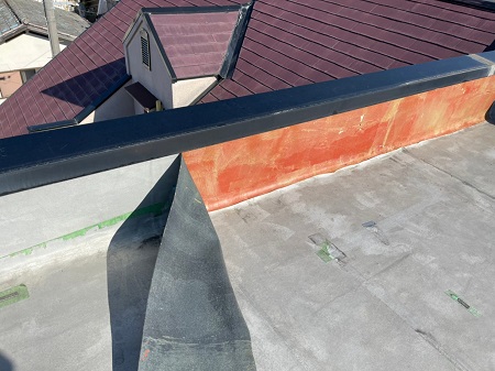 次に、立ち上がり部分の劣化した塩ビシートを剥がしていきます。下地の処理・清掃をしていきます。今回立ち上がり部分は塩ビシート密着工法となっております。