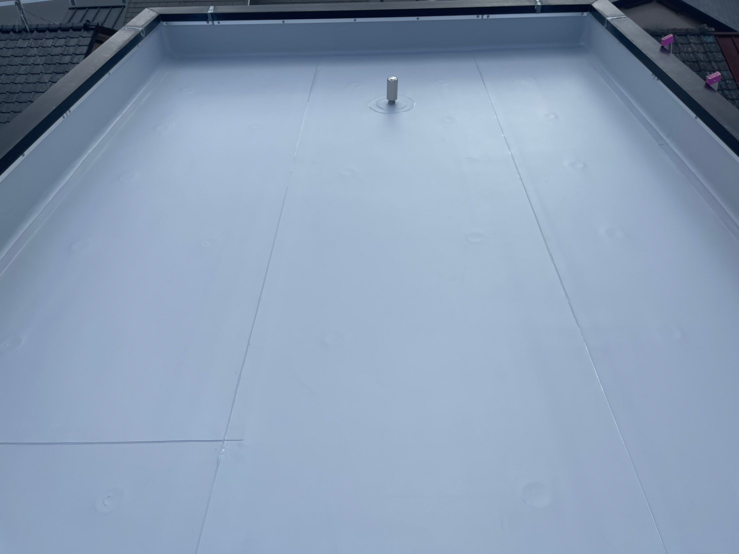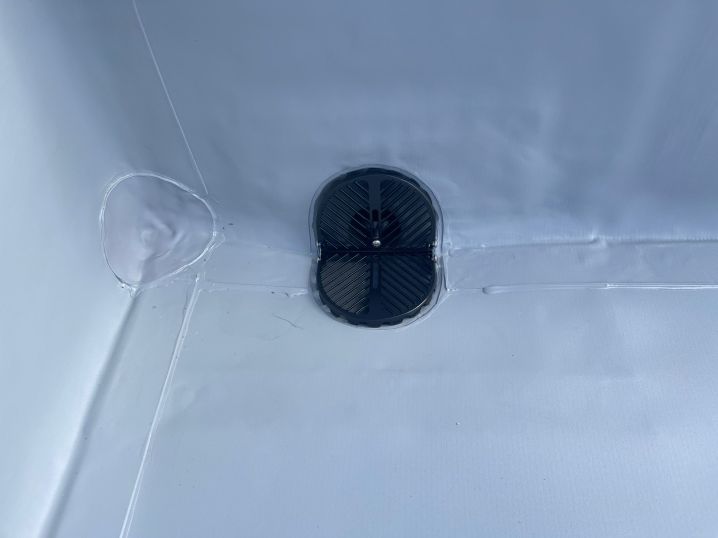 こちらが脱気筒となります。こちらも溶着剤でしっかり張り付けていき熱風機をおしようして融着していきます。脱気筒は塩ビシートの下に溜まった湿気を逃してくれる役割があるので大事です。