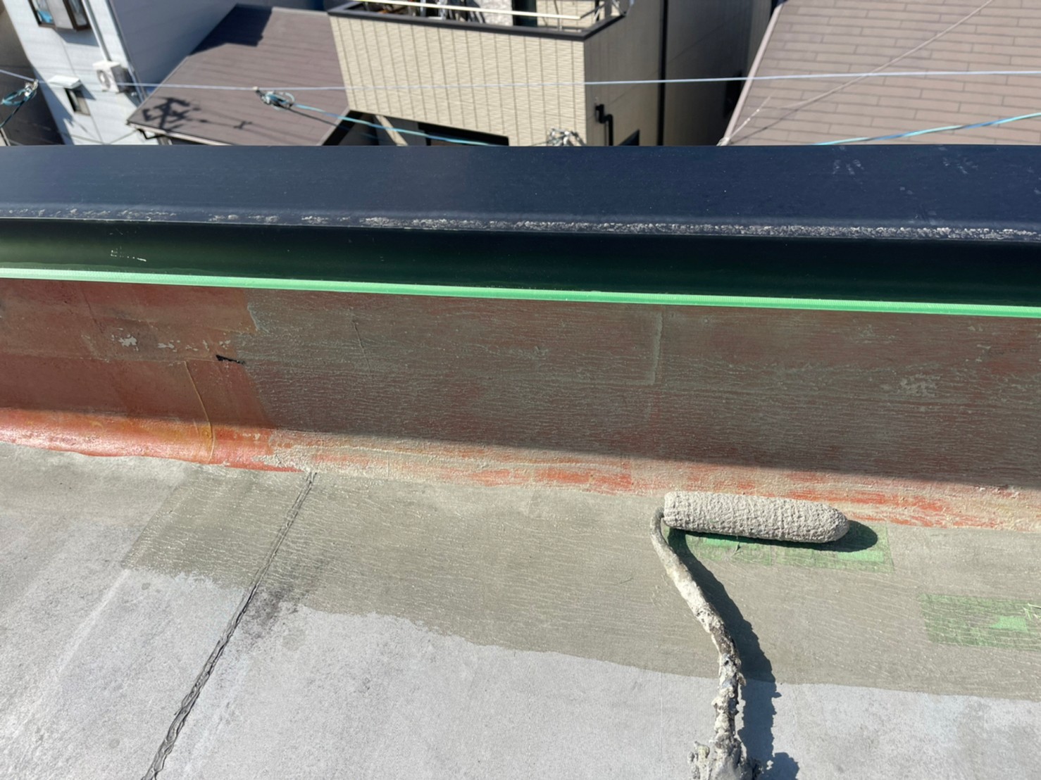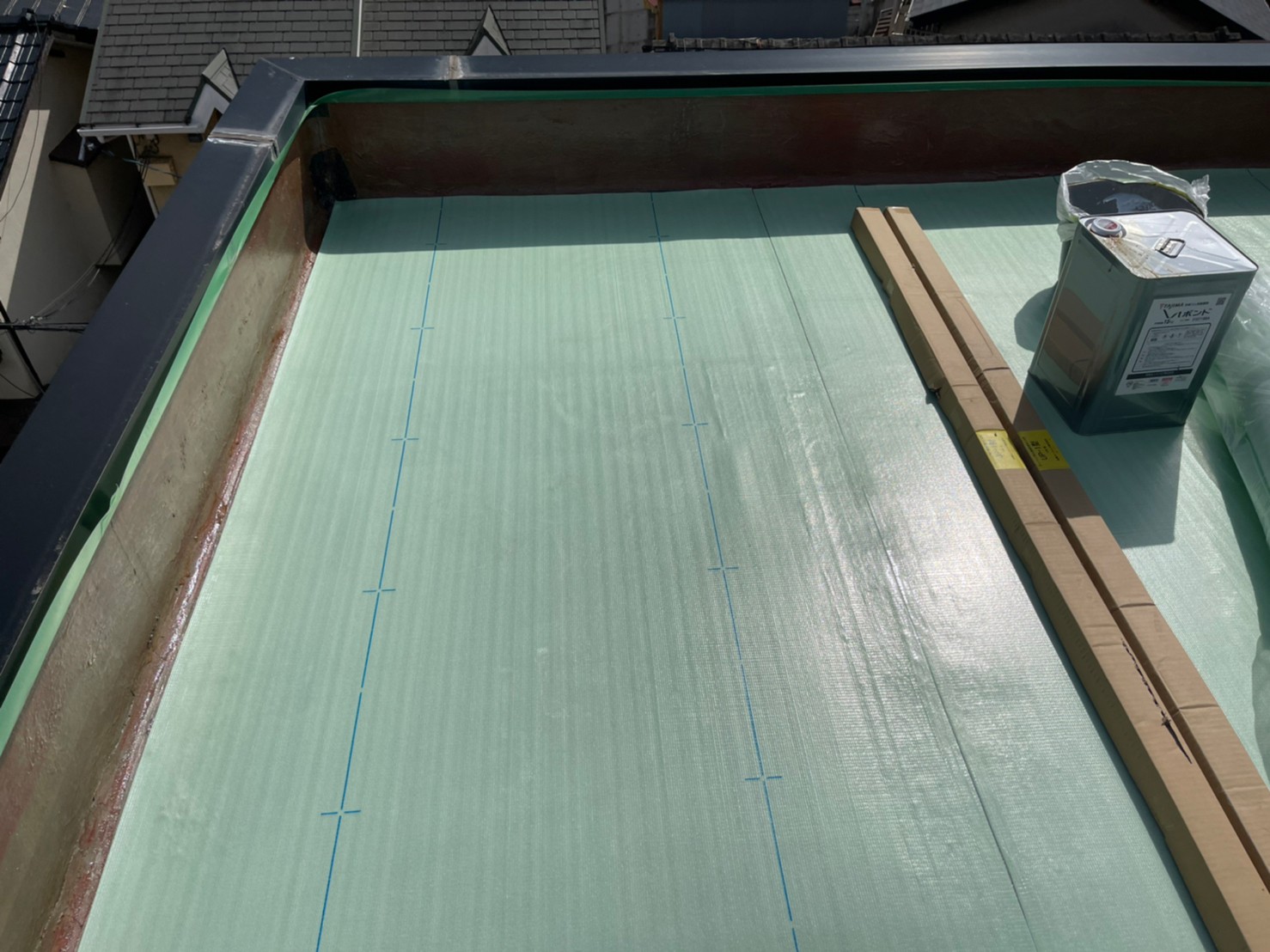 こちらの立ち上がり部分は密着工法となっています。こちらも接着剤を下地とシートの裏側に均一に塗布していきます。