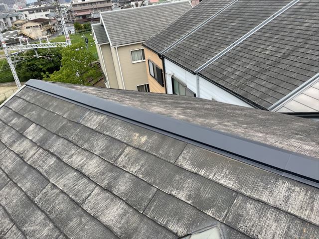 棟板金のつなぎ目部分はしっかりとコーキングを充填し重ね付けます。完成となります。