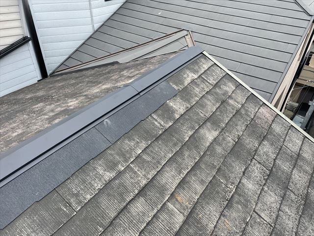 今回は、棟板金部分と屋根の剥がれ部分の補修を行いましたが、カラーベストも劣化しておりますので、塗装をしたほうがよろしいかと思います。いつでもご相談ください