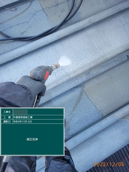 高圧洗浄で綺麗に洗い流していきます。洗い流した後にプライマーを塗布していきます。今回は、日本ペイントのハイポンファインプライマーを使用しました。