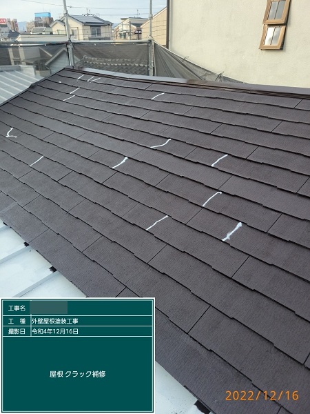 こちらは、スレート屋根部分のクラックの補修の様子になります。