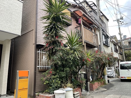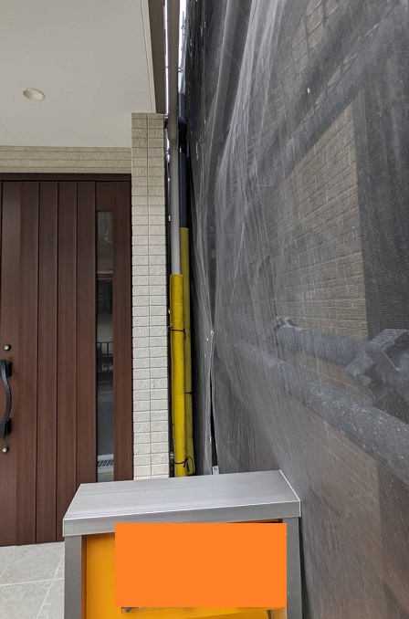 現場調査では、隣家様との幅が30センチ程しかないとお伝えいたしました。非常に狭いですが、足場は何とか組めました。