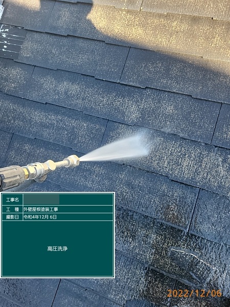 まずは、高圧洗浄で綺麗に洗い流していきます。汚れを綺麗に落としておかないと次の塗装の密着が悪くなってしまいますので、重要な工程になります。