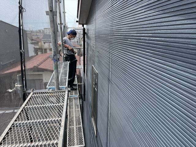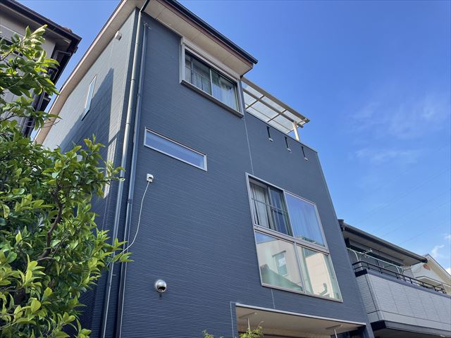 こちらのサイディング部分は、黒っぽい塗料を使用しています。こちらの色名は、蝋色といいます。どちらも、日本ペイントパーフェクトトップを使用しております。