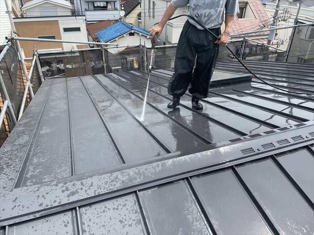 屋根や外壁、その他を高圧洗浄で綺麗に洗い流していきます。