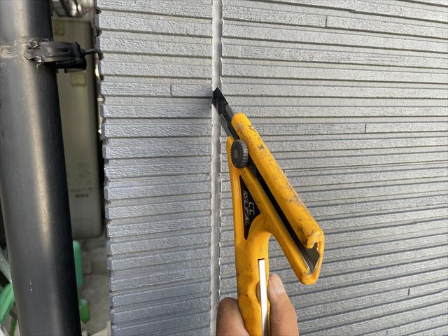 既存のコーキングを専用のカッターで両端を切っていきます。