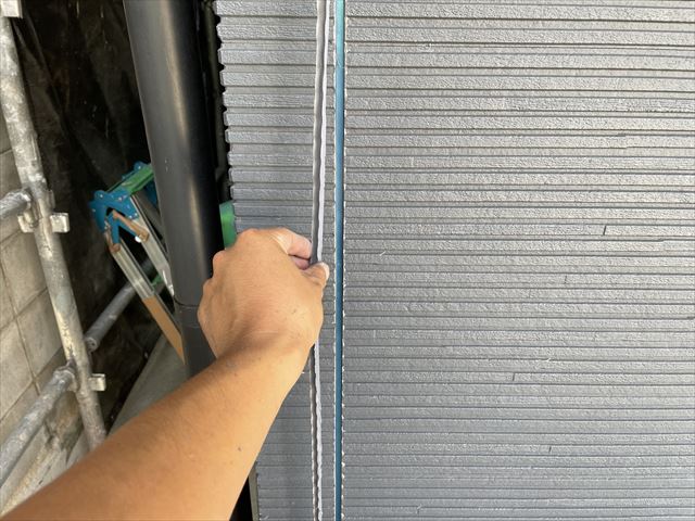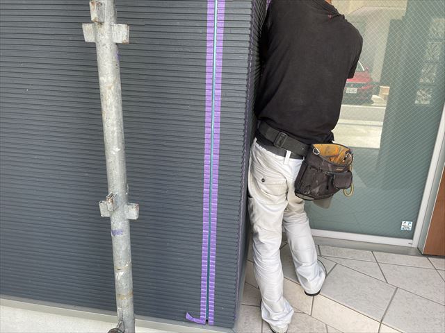 養生テープを貼っていきます。外壁がコーキングで汚れないようにしっかりと養生テープをまっすぐ貼っていきます。少し長めに切って端っこを取れやすいように形を作っておきます。剥がしやすいようにする工夫です♪