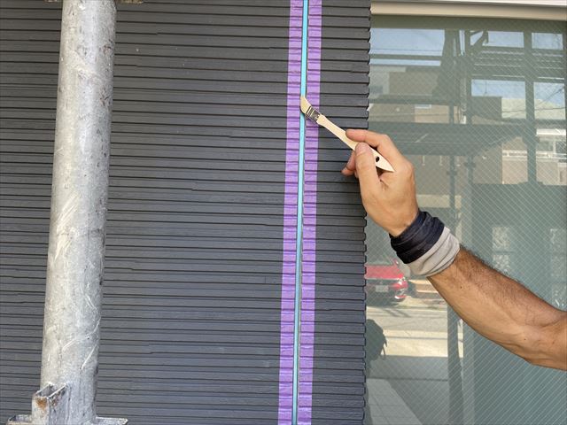 プライマーを塗っていきます。このプライマーは接着剤の役割をしています。外壁部分とコーキングがしっかり密着するようにプライマーが接着してくれます。