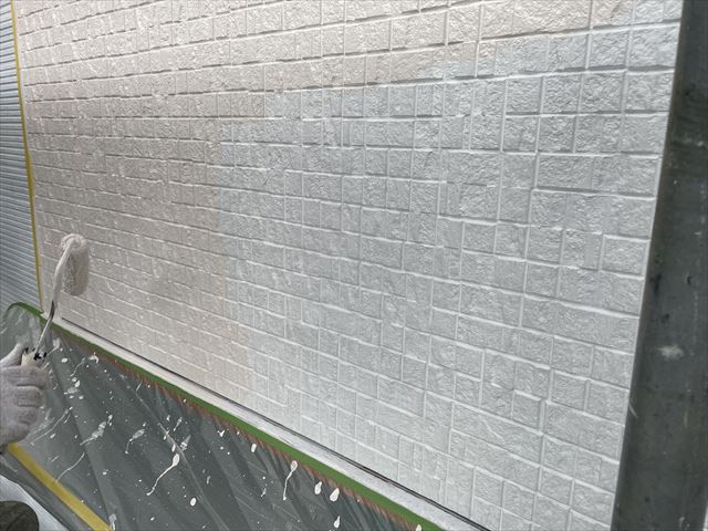 こちらが外壁塗装上塗り1回目の様子になります。こちらのレンガ調のサイデイング部分は白っぽい塗料で仕上げていきます。色名は、ネールピンクと言います。