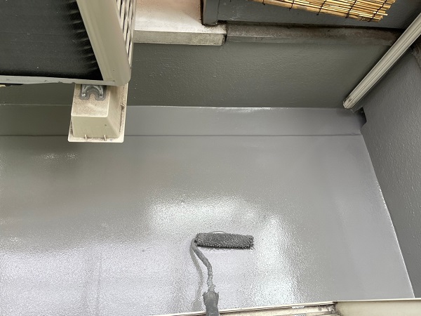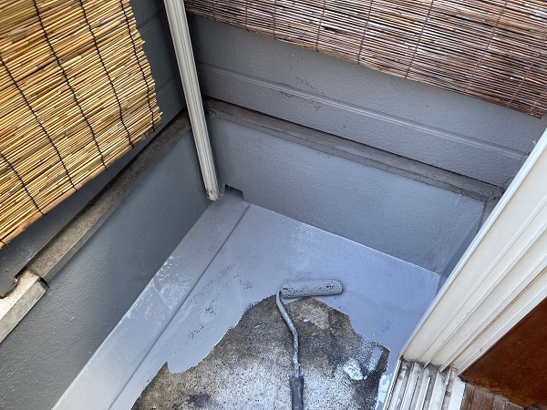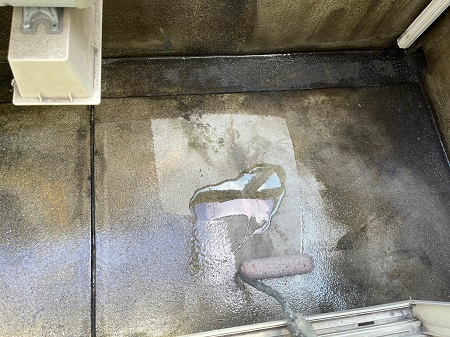 立上り部分を塗装していきます。こちらは立ち上がり専用のウレタン塗装になります。平場部分のウレタンよりも粘性が固くなっています。