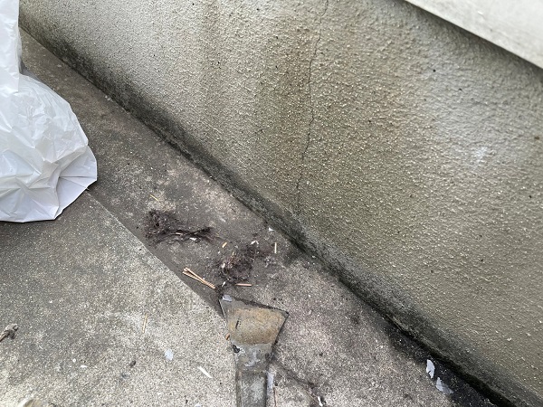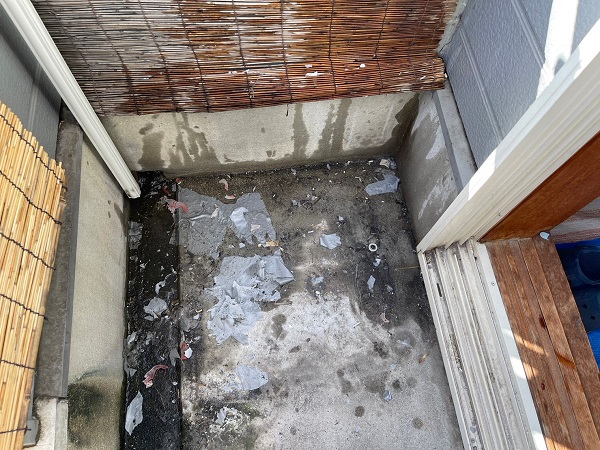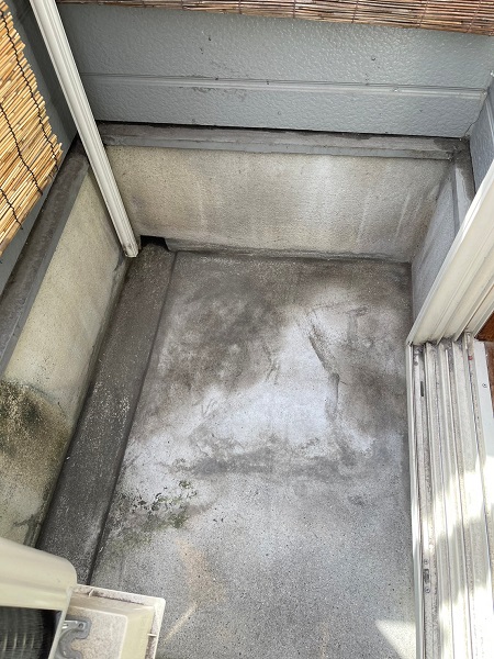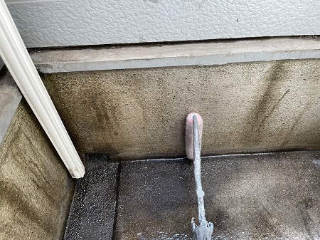 洗濯機をのけた部分ですが、ベランダを綺麗にして下地を整えていきます。