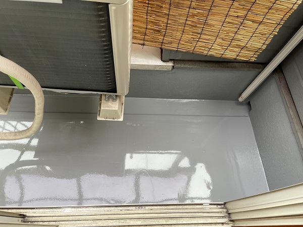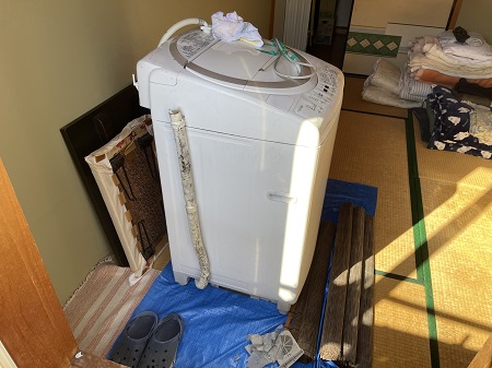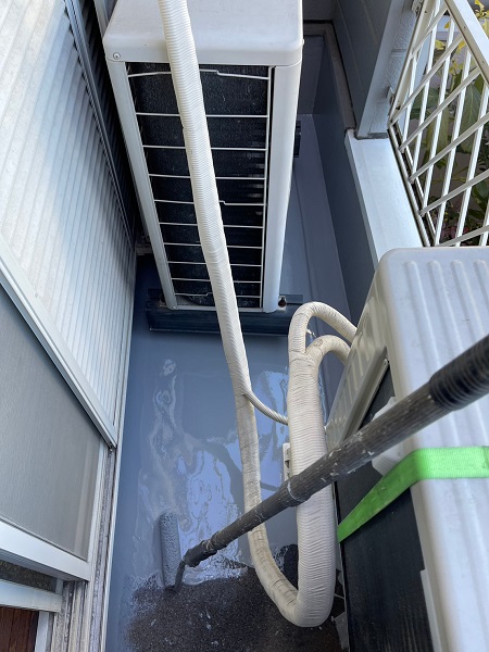 まずは下地を綺麗にしていきますが、ベランダに洗濯機と室外機2台があるのでそちらの方を移動などしていきたいと思います。まず洗濯機を室内に移動させていただきました。電化製品の為、故障してしまうかもしれないという事を事前に施主様にはお伝えしております。