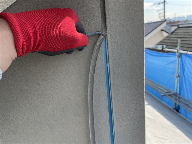 切れ目を入れたコーキングを手で剥がしていきます。劣化が激しければ激しいほど、簡単に手で剥がれます。