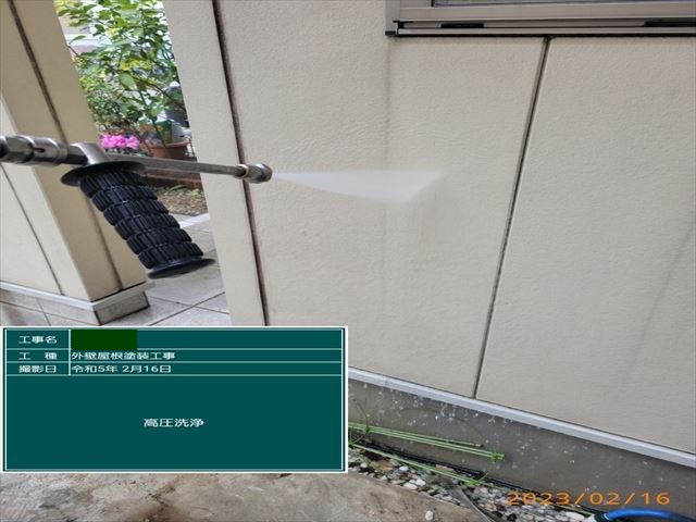 高圧洗浄で外壁や雨戸などを綺麗に洗い流していきます。乾燥させてから外壁塗装に入ります。
