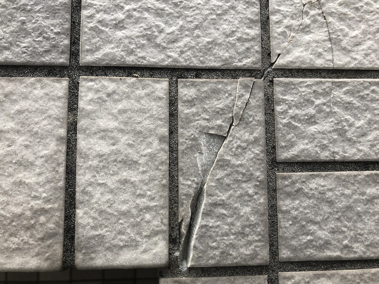 外壁タイル部分が割れていしまっています。他にも苔が生えてしまったりしている箇所も確認しました。劣化症状をみて今回はカバー工法で補修していく事になりました。