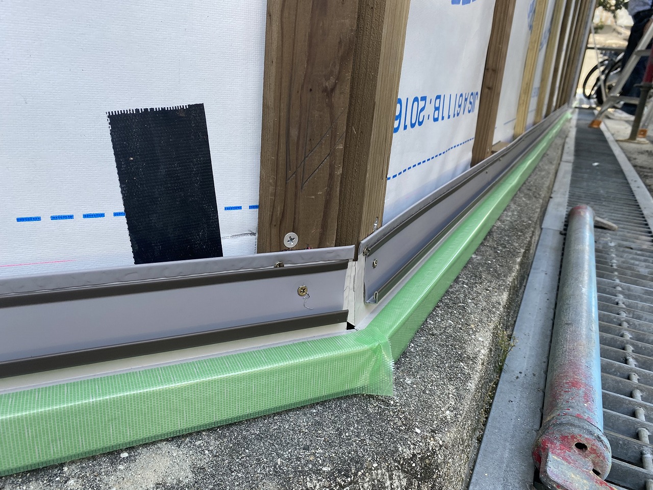 土台水切り、スターターを取り付けて窓廻りや外壁のつなぎ目には見切り縁と呼ばれる金物を取り付けていきます。この金物に金属サイディングを差し込んで固定させていきます。