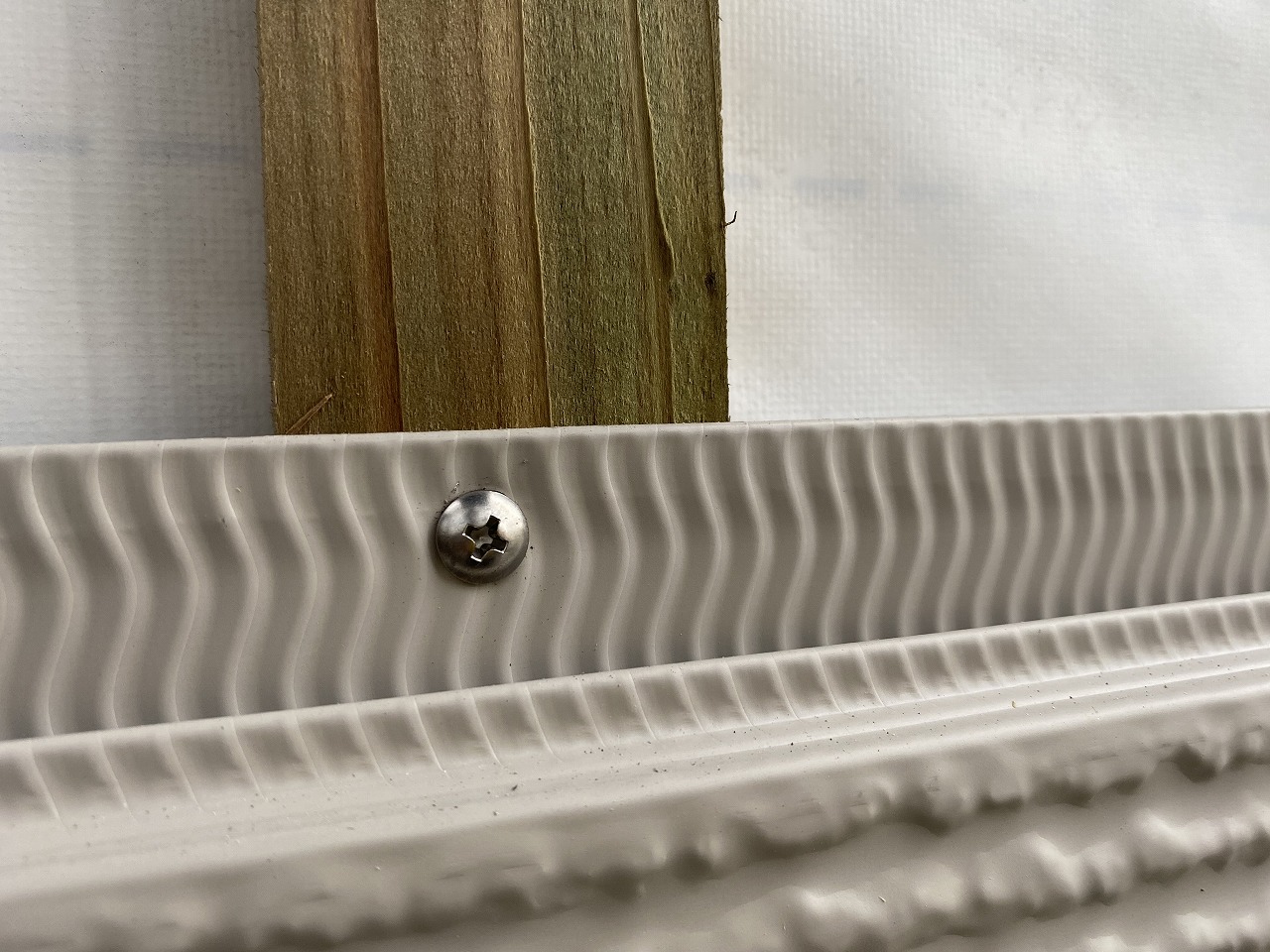 透湿防水シートを貼り終えた後は、胴縁を取り付けていきます。胴縁と胴縁の間に空気層ができます。裏側に水分が入り込んだとしても空気層がある為、外壁内に雨水が入っても排除される構造になります。