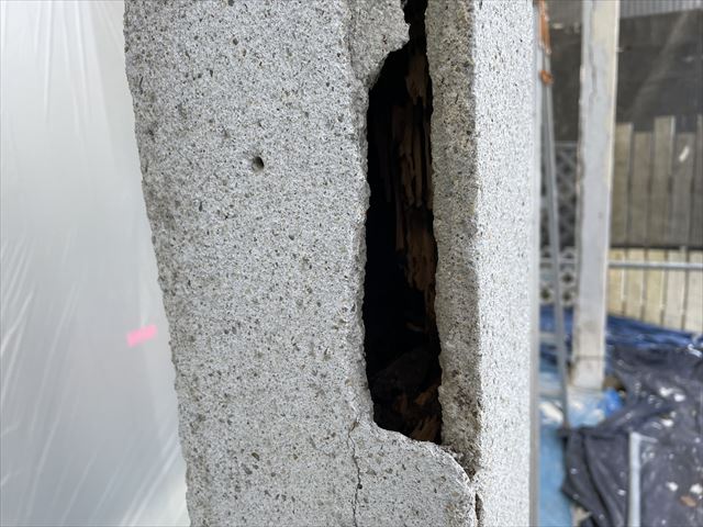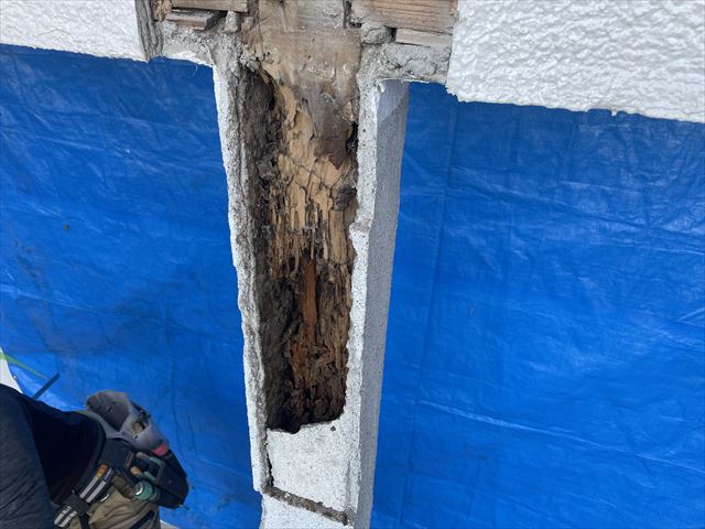 外側のモルタルを捲ると木の柱が腐食していました。ボロボロです。