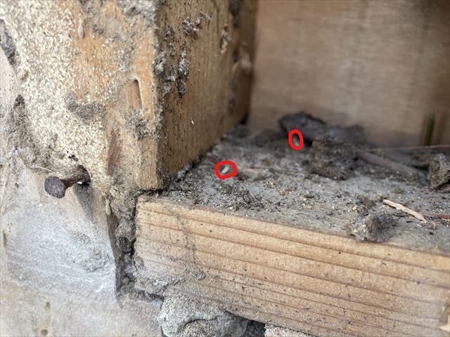 木が濡れているとシロアリが食べに来ます。【赤丸部分がシロアリです】
