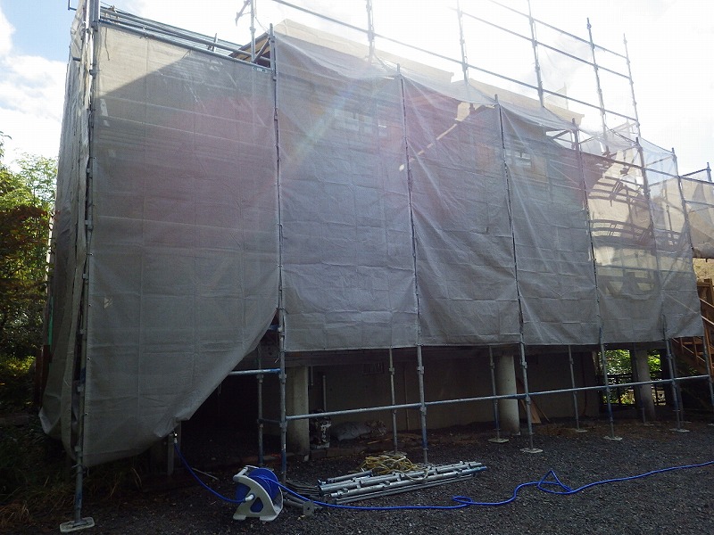足場組立。急勾配の為屋根にも足場を組みました。