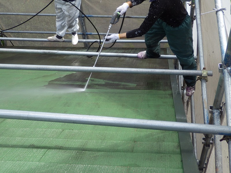 高圧洗浄で旧塗膜とコケを除去。 急勾配で面積が大きいので丸1日かかりました。