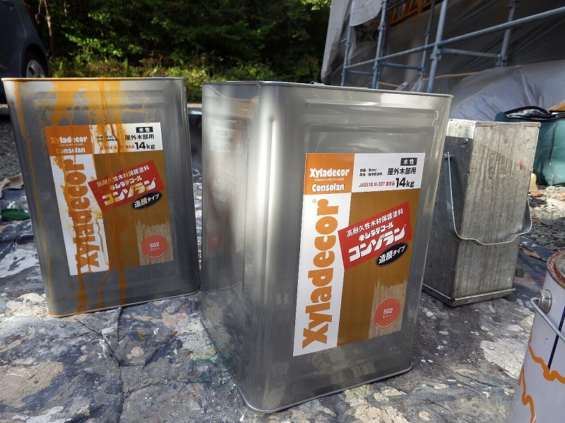 1回目の塗装。 浸透タイプの木部保護塗料では現状より明るくすることはできませんが、造膜タイプならこのように好きな色にできます。