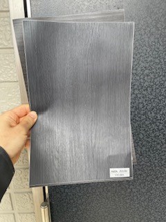 今回玄関の扉部分にダイノックシートを貼っていきます。こちらの柄のシートを貼っていきます。サンプルを取り寄せて現地で検討したうえで施工させていただきました。カタログだとサンプルが小さいのでいくつか候補を選んでいただき大きいサンプルを取り寄せました。