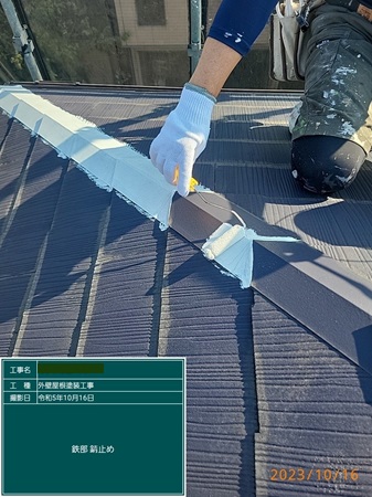 鉄部の錆止め作業です。棟板金に錆止めを塗っています。鉄部が劣化して錆ができることがあるため錆止めは必ず塗布します。