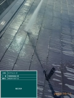 まずは屋根の高圧洗浄を行います。外壁同様、汚れや古くなった塗膜等を綺麗に洗い流していきます。