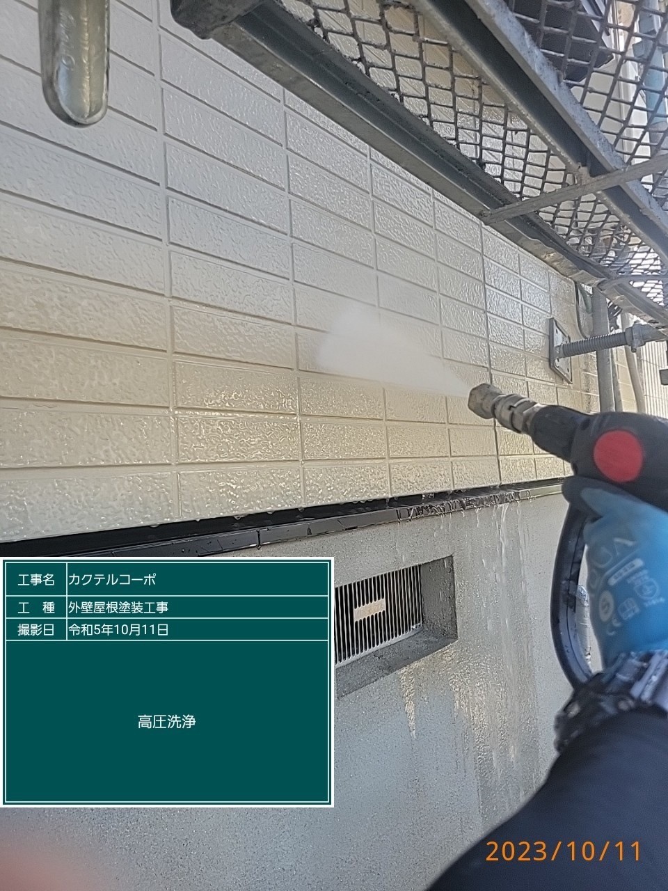 外壁の高圧洗浄の様子です。