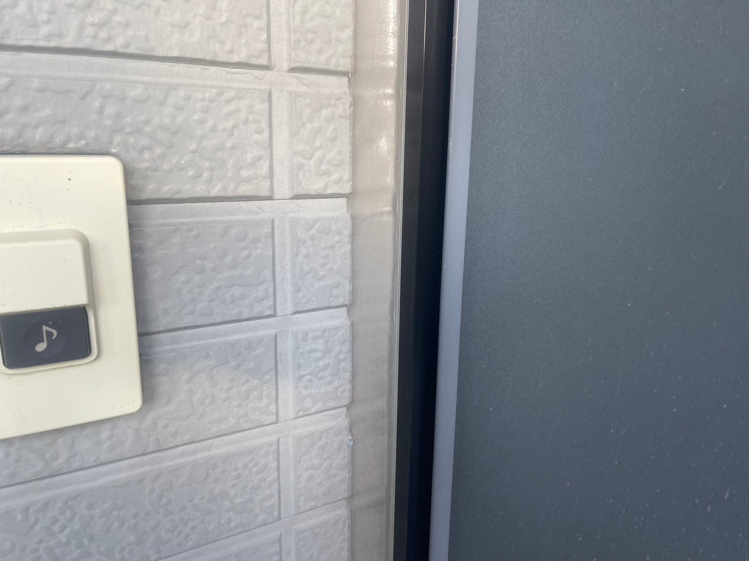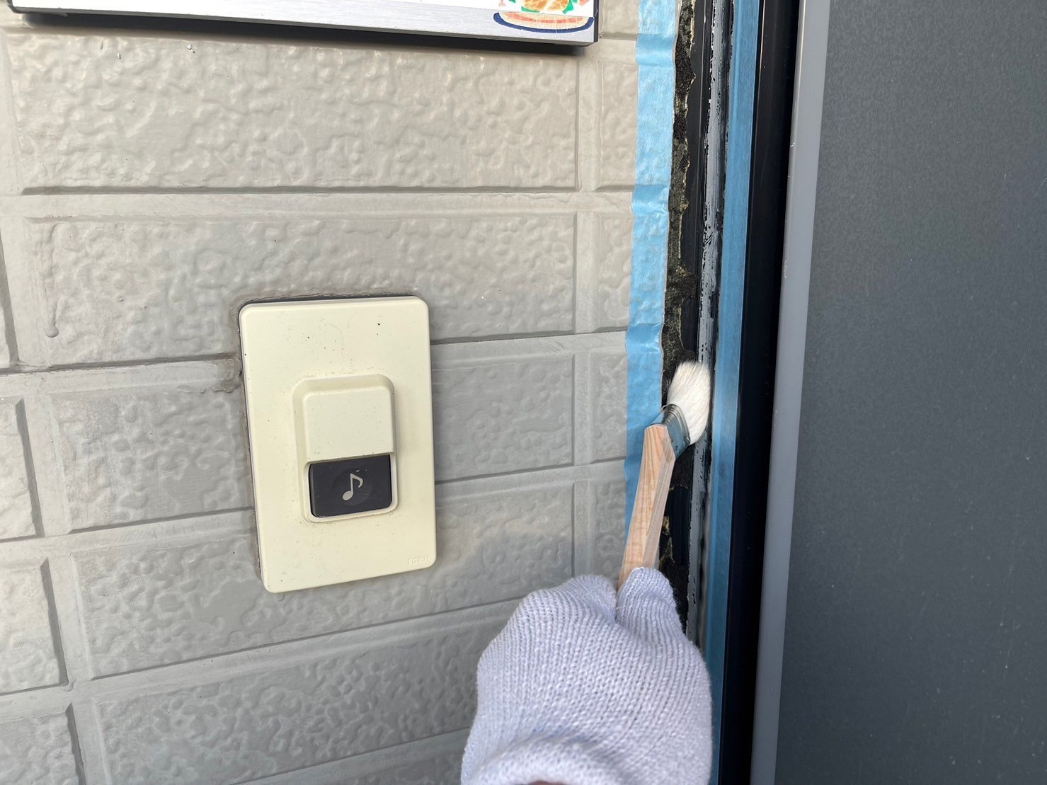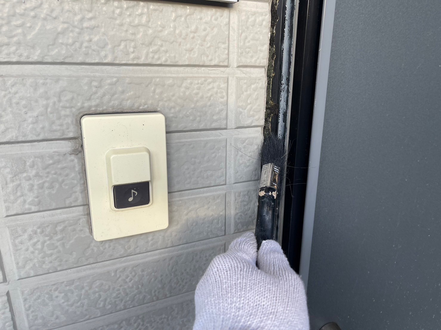 玄関のドア廻りのコーキングを剥がしているところです。施工手順は先ほどと同じ要領になります。