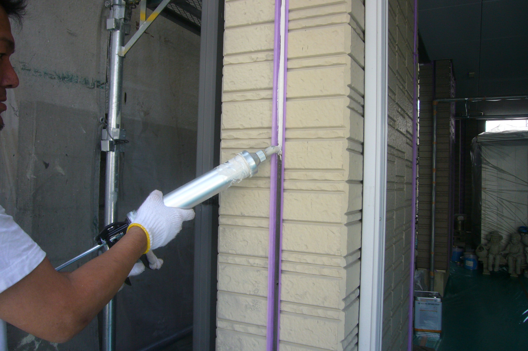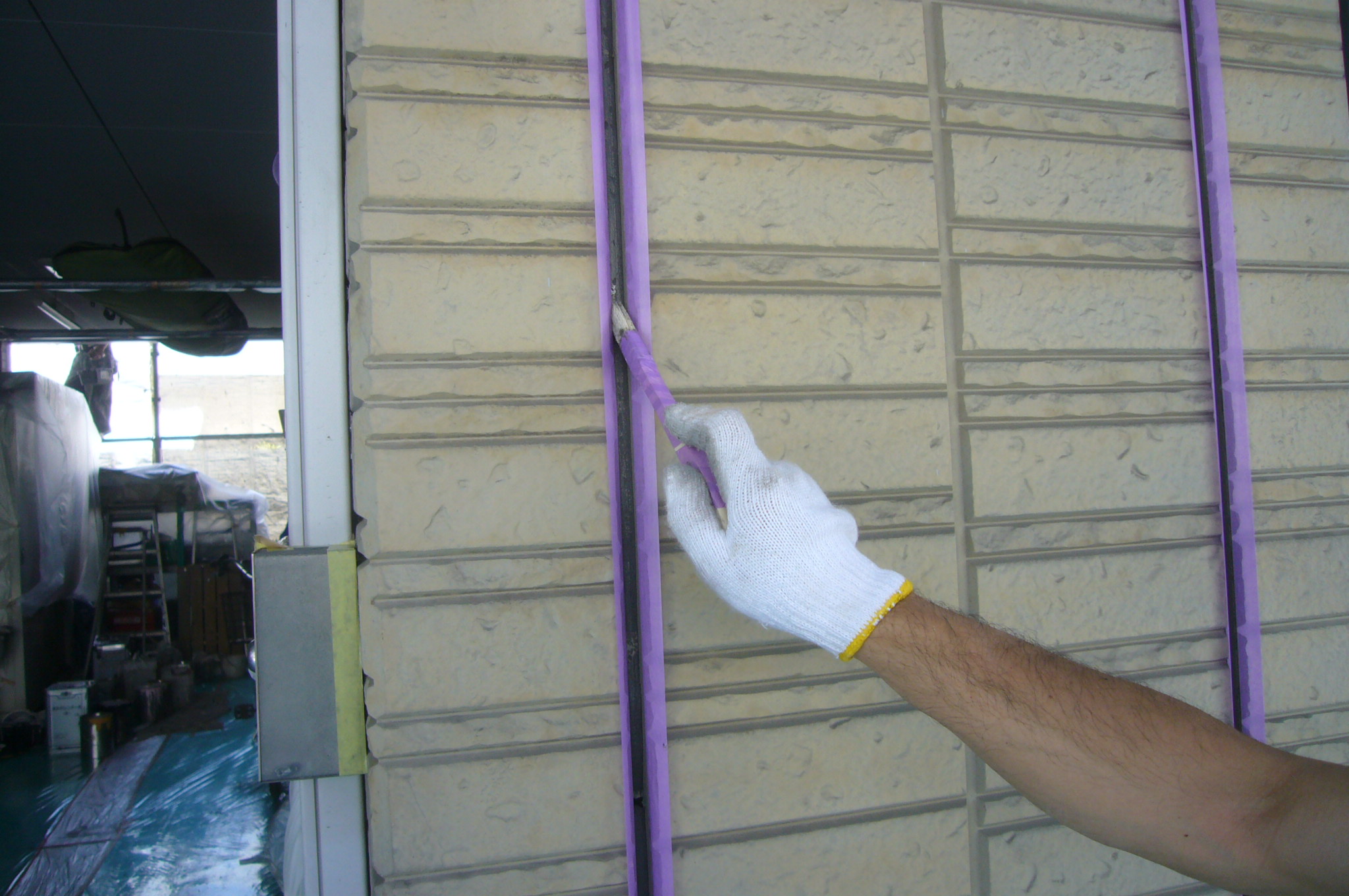 ゆっくり丁寧にサイディングの目地を補填していきます。シーリング材は15年以上もつといわれています。 一日かけて乾かすので今日の作業はここで終わりです。