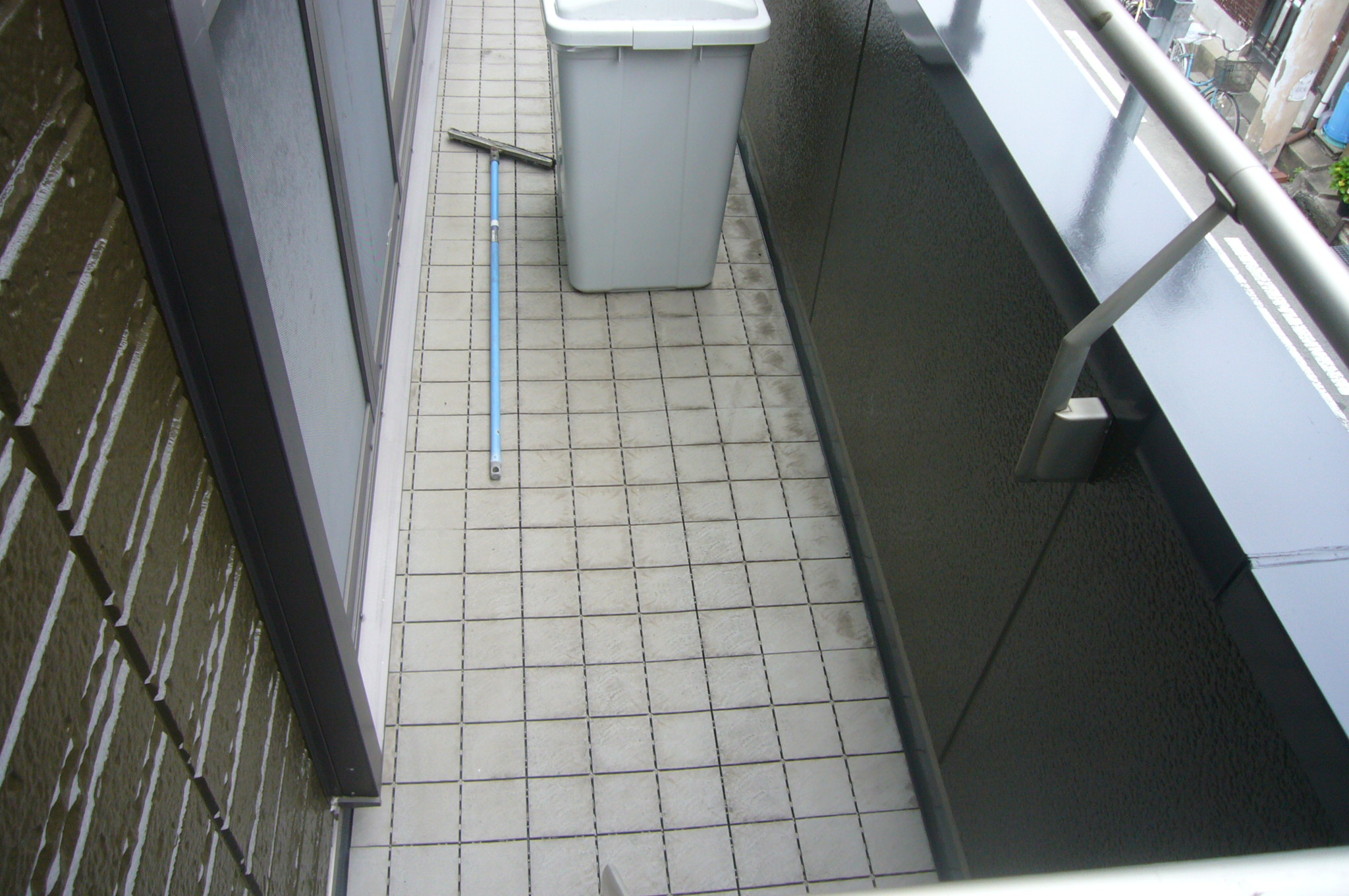 ベランダ防水する前です。ベランダの上にはプラスチックの小さい正方形でつながっているシートがあったので一度取り除きます。