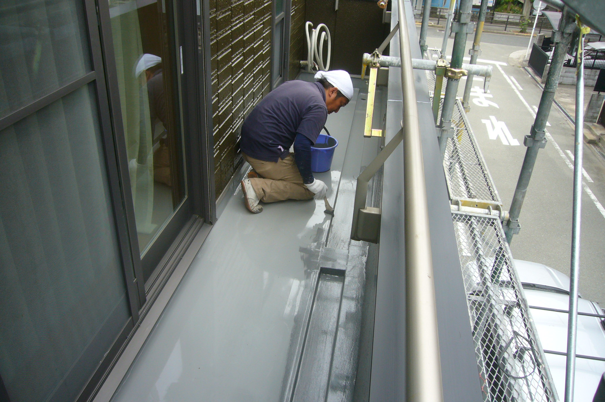 下塗り、中塗り、外塗りが終わり残るはベランダの防水と屋根の塗装になります。 屋根は合同塗料マイルドシリコンという塗料を使用しています。 三度塗りをする必要がなく二度塗りで施工できるすばらしい塗料です。