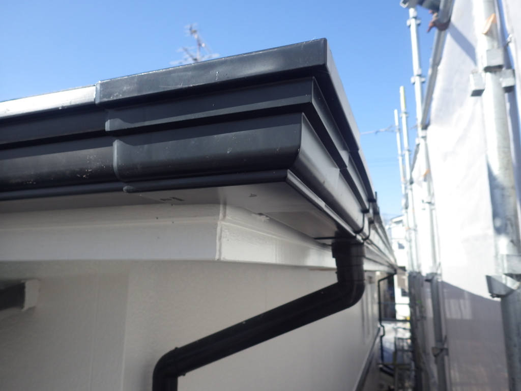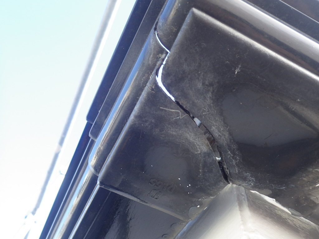 変なところで割れていたので、職人さんに原因を尋ねると、寄棟の軒樋は切り妻屋根と違って樋が一周ぐるっとつながっているので、気温の変化で伸び縮みする軒樋にはその伸び縮みを吸収する切れ目を設けないといけないそうです。