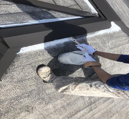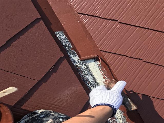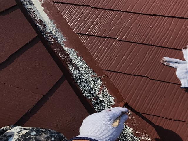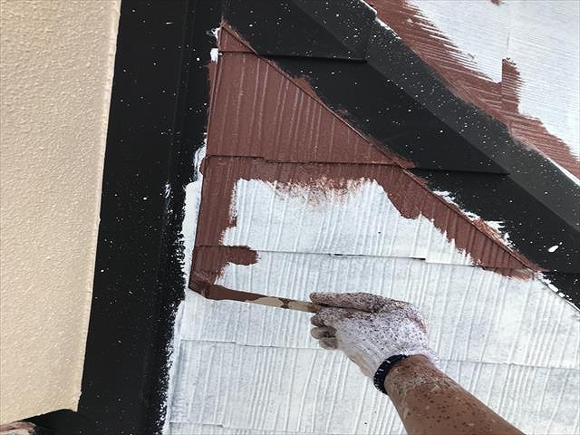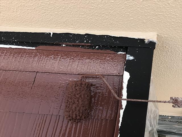 洗浄が終わったら屋根の板金部分に錆止めを塗っていきます。
