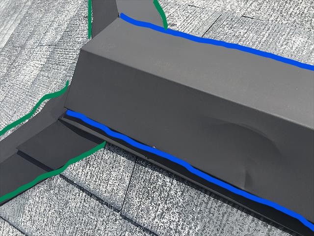 (写真/青いライン=大棟・緑ライン=隅棟)